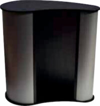 Banchetto promozionale autoportante con frontale in polipropilene cannettato grigio da 1 cm, collegato ai due ripiani mediante aggancio in velcro. Ideale per fiere ed eventi ripetuti nel tempo. Il prodotto è bello, a cominciare dal grazioso top nero in legno poro aperto con design a goccia. La struttura supporta prodotti più pesanti rispetto a PROMOTIONAL DESK. Il prodotto è privo di ripiano intermedio. Banchetto promozionale di nuova generazione, si compone di sole 3 parti: 2 piani orizzontali e pannello grafico verticale, consentendo a chiunque l’assemblaggio in 30 secondi. Il volume ridotto consente la spedizione per via aerea.